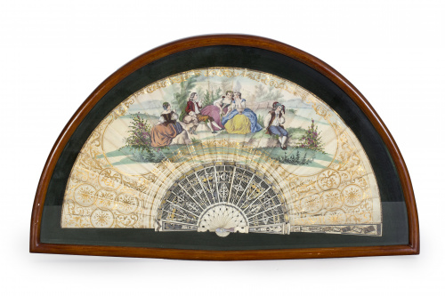 854. Abanico litografiado, iluminado y dorado con una escena de cortejo en un paisaje, padrones de nácar, decoración de plata corleada y tallada.