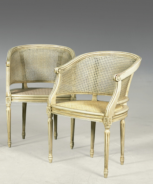 884. Pareja de “fauteuil de cabinet” de estilo Luis XVI lacadas de blanco.Trabajo español, h. 1900.