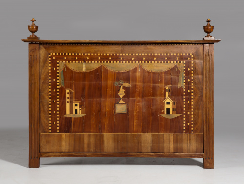 Cabecero Carlos IV en caoba y trabajo de maderas finas y maderas teñidas con decoración de arquitecturas, quizás trabajo madrileño ff. del S. XVIII - pp. del S. XIX..