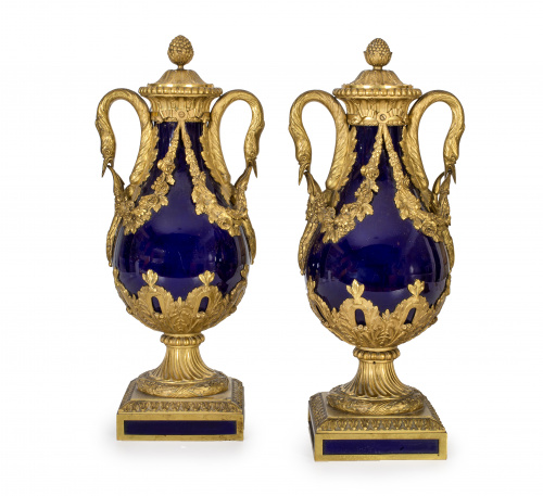 Pareja de copas de porcelana esmaltada en azul real y bronce dorado.