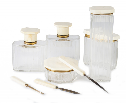 Home / SUBASTA DE JULIO / Juego de tocador de cristal tallado con tapas de marfil.Fr