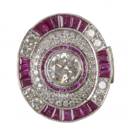 El brillante central, de 1,83 ct, está rodeado de pequeños rubíes calibrados, a su vez se enmarca en óvalo de pavé de brillantes y el contorno exterior presenta rubíes calibrados en bandas, alternos con parejas de brillantes.