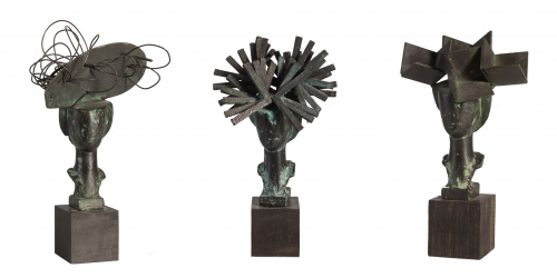 Tres esculturas en bronce patinado sobre peana de ébano.