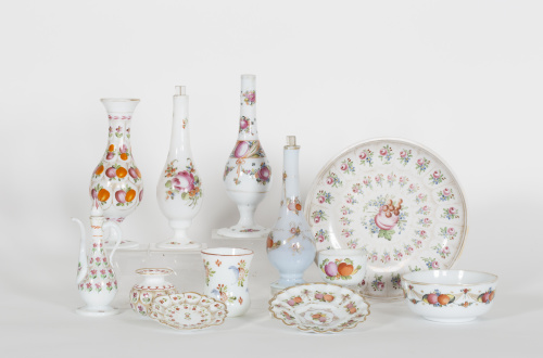 1038. Lote de doce recipientes y platos en opalina esmaltada.