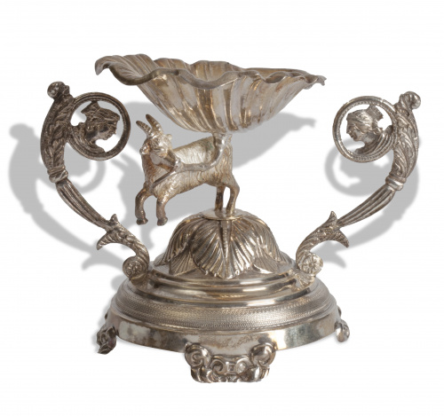Recipiente con forma de venera, asas con perfiles femeninos clásicos y cabritilla.