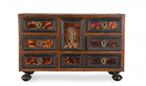 Con siete cajones y cajón central con la figura de Hércules en bronce.