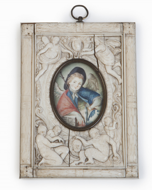 Home / SUBASTA DE OCTUBRE / Miniatura de San Rafael con marco de marfil tallado con fig