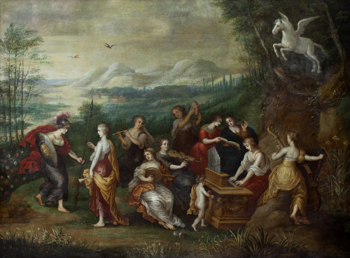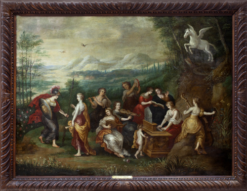 Este magnífico cobre, firmado por Van Balen, representa el momento en que la Diosa Minerva visita a las musas en el monte de Helicón. Sobre un riquísimo paisaje de delicada factura y cuidadosos detalles vegetales y florales, el pintor dispone el grupo de las nueve musas que mueven sus brazos acorde al ritmo de los instrumentos musicales y las partituras; cantan las maravillas de los Dioses y son una personificación de las virtudes invocadas por poetas y pintores. Cerrando ésta equilibrada composición, la figura de Minerva a un lado y, al otro en lo alto Pegaso que rompe con una coz la roca donde mana un torrente de agua cristalina. Según la mitología griega: “las Piérides se enfrentan con las Musas en un concurso de canto al pie del monte de Helicón, este tan complacido por la belleza de las voces que empezó a crecer de manera desmesurada amenazando con llegar al cielo. Al ver el peligro, Poseidón mandó al caballo alado Pegaso que fuera y golpeara la montaña con uno de sus cascos para ordenarle que volviera a su tamaño natural, a lo que la montaña obedeció dócilmente, pero en lugar donde Pegaso la había golpeado brotó la fuente de Hipocrene”.