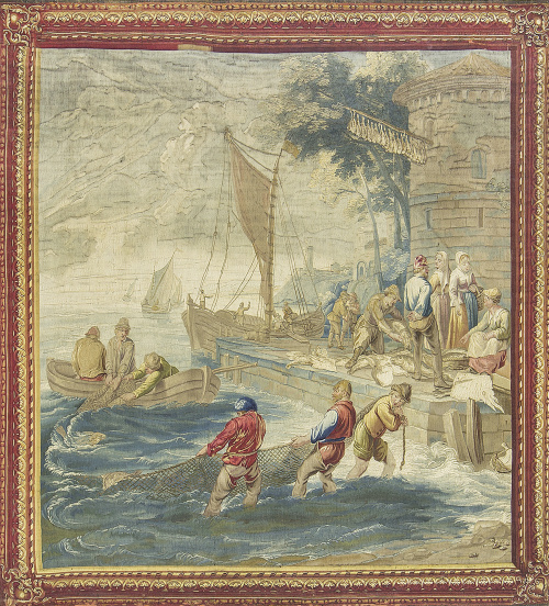 Tapiz en lana y seda con escena de puerto a la manera de Teniers.