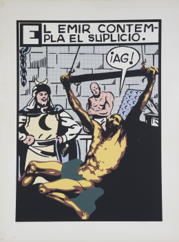 volumen sino que este es sugerido por medio de unas gruesas líneas negras que dibujan el contorno. Sobre este contorno se aplica el color buscando un mayor realismo gracias a la utilización de una gama de colores primarios más la gama de grises.