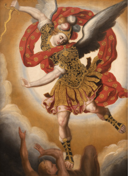 El arcángel San Miguel, según la tradición judeocristiana, condujo a los ejércitos celestiales a la victoria sobre Satanás y los ángeles rebeldes. Durante la Contrarreforma, los Arcángeles se convirtieron en potentes símbolos como defensores de la fe en contra de las herejías protestantes y paganas. En el Nuevo Mundo, las figuras de los arcángeles fueron una constante en sus pinturas, adoptaron a esta criatura celestial como una de las fuentes de la iconografía cristiana reconociendo su forma de vestir y asociándose con él como valientes guerreros.
