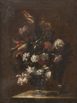 694. DIEGO VALENTÍN DÍAZ (Valladolid,1586-1660)Rosas, peonías, claveles, nardos, bella del día y otras flores en un jarrón de cristal sobre un pedestal de piedra