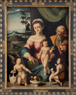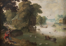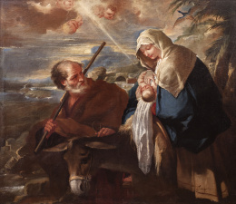 Lienzo, firmado, “Jordanus. F.” en el ángulo inferior derecho que representa el pasaje de la Huida a Egipto según el evangelio de San Mateo (Mt:2,13 Y 14). La Sagrada Familia huye a Egipto de la persecución decretada sobre todos los menores de dos años nacidos en Belén, una vez advertido Herodes por los Reyes Magos del nacimiento del rey de los judíos.