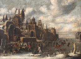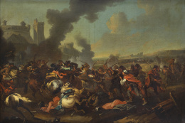 La obra que presentamos inscrita en el ángulo inferior derecho con número de inventario "1036", es una representación de la caída de Troya, inspirada en los pasajes que se narran en el final del Canto II de la Eneida de Virgilio. El ataque de los griegos, que se introdujeron en la ciudad en el interior de un gigantesco caballo para destruir e incendiar todo cuanto se encontraban a su paso, se produjo por la noche. El pintor inmortaliza el momento de la lucha de los griegos y troyanos representados en un primer término a la izquierda. En un segundo plano, el gigante caballo. A la derecha, en podemos identificar a Eneas, llevando sobre sus hombros a su padre Anquises, e inmediatamente detrás su esposa Creusa, dando la mano al hijo de ambos Ascanio. La escena se representa entre arquitecturas fantásticas de intensos efectos decorativos, compuestas de amplias y ricas perspectivas que quedan iluminadas por el resplandor de los incendios que aparecen en el fondo de la composición.