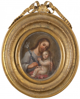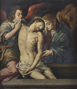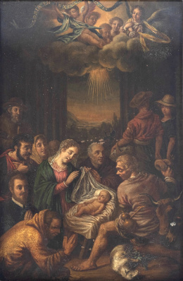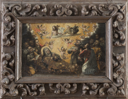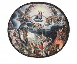 La obra que presentamos consta de dos cobres montados en un tondo sobre columna en madera tallada y dorada. Dicho montaje, nos hace pensar que pudiera haber sido concebida con un fin devocional doméstico. En uno de los cobres, el Juicio Final, basado en el grabado de Hans Sadeler de hacia 1588- 1595 según un dibujo de Christoph Schwartz (1545-1592). Con una delicadeza esquisita el pintor ejecuta la complicada escena del Juicio Final con un programa iconográfico ambicioso. En la parte superior, un rompimiento de Gloria, en el centro Cristo sobre un arco iris, con los pies apoyados sobre un globo terráqueo y los brazos en alto, flanqueado por la Virgen y San Juan el Bautista. Les rodean un grupo de ángeles músicos, ángeles que portan los intrumentos de la pasión, los Arma Christi: la columna de la flagelación, la corona de espinas, la cruz y los clavos que simbolizan su triunfo sobre la muerte y el pecado, los doce apóstoles y otros santos. En la parte inferior, San Miguel Arcángel en el centro de la composición, a un lado la representación del Paraiso con las almas de los salvados y a la derecha el infierno con almas de los condenados. En el otro cobre, sobre un paisaje Cristo en la cruz, acompañados de cuatro ángeles que recogen la sangre de Cristo en unos cálices. En la parte inferior, la Virgen María,  San Juan y María Magdalena.