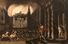 682. ESCUELA ESPAÑOLA, SEGUNDO TERCIO DEL SIGLO XVIICapricho arquitectónico con el Incendio de Troya