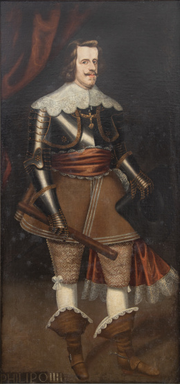 Obra inscrita en el reverso con anagrama, “AA”, que nos permite identificar al retratado: Alonso Manrique de Lara y Silva, I Duque del Arco (1672-1737), mayordomo real, caballerizo mayor y Grande de España. Se casó en 1695 con Mariana Enríquez de Cárdenas, XVI condesa de la Puebla del Maestre, VII marquesa de Bacares y II condesa de Montenuevo. Fue nombrado mayordomo de la Reina el 25 de octubre de 1688. En 1695, recibió el cargo de gentilhombre de cámara de su Majestad y su primer caballerizo. Acompañó a Felipe V en las campañas de Portugal (1702) y de Cataluña (1706). En 1712 fue nombrado caballero de la Orden Militar de Santiago y comendador de Valencia del Ventoso. Dos años después recibió los cargos de montero y ballestero mayor y salvó valerosamente al rey del ataque de un jabalí malherido. Este hecho le valió el título ducal y la Grandeza personal (26 de abril de 1715), y sobre todo el aprecio del monarca, del que no se separó nunca. También fue distinguido en 1724 como Caballero de la Orden del Toisón de Oro. Fue propietario del Palacio de la Quinta desde 1717. A su muerte, la duquesa viuda lo dona a Felipe V e Isabel de Farnesio, quienes lo incorporaron al Real Sitio de El Pardo.