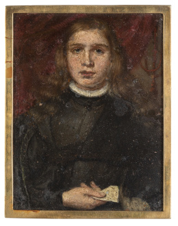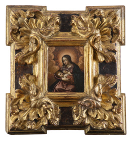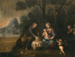 Esta obra maestra de pequeño formato emerge como una joya devocional de excepcional calidad y estado de conservación impecable. La escena, inspirada en los evangelios apócrifos, nos lleva a un momento transcendental durante el viaje de la Sagrada Familia a Egipto, donde un grupo de ángeles sirvió frutas a San José, la Virgen María y al niño Jesús.