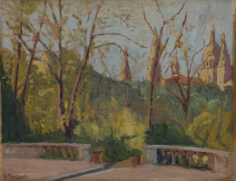 Óleo sobre lienzo. 73 x 92 cms. Firmado áng.inf.izq. Firmado en el reverso. PROCEDENCIA: Galería Fauna’s, Madrid. Colección particular. Por herencia al actual propietario. BIBLIOGRAFÍA: Raúl Chávarri, “La pintura española actual”, Madrid, Ibérico Europea de Ediciones, 1973, rep.b/n.pág.281. María Jesús Ávila Corchero, “El pintor Ortega Muñoz 1899 - 1982”, Tesis doctoral inédita, Cáceres, Facultad de Filosofía y Letras, Universidad de Extremadura, noviembre de 1994, rep. Tomo III, s/p. Isabel García García, “Godofredo Ortega Muñoz. Catálogo razonado”, Fundación Ortega Muñoz, nº.291. rep.b/n.pág.424 (cat.online en: www.ortegamunoz.com). La presente obra, pintada c.1965, nos muestra en toda su grandeza la personal forma de representar el paisaje que tenía Godofredo Ortega Muñoz y que tantos éxitos y reconocimientos le proporcionó ya en vida, especialmente en los años 50 y 60, con exposiciones en la Tate Gallery de Londes (1955), Fundación Solomon R.Guggenheim de Nueva York (1960), La Maison de la Pensée Française, París (1962), Salas de honor en la Nacional de Bellas Artes de Barcelona (1968) y la antológica en el Casón del Buen Retiro (1970), entre otras. Al final de la guerra civil, el artista se instaló definitivamente en España entre San Vicente de Alcántara; donde situó su estudio y Madrid; donde participó activamente de la llamada Escuela de Madrid, siendo uno de los grandes protagonistas de la renovación del género paisajístico, junto con Benjamín Palencia, Juan Manuel Díaz-Caneja, Vaquero Palacios y Rafael Zabaleta entre otros. Esta nueva forma de representar el paisaje es especialmente interesante en la obra de Godofredo, principalmente a partir de los años 50, cuándo empieza a centrarse casi exclusivamente y de manera obsesiva en el paisaje rural con sus campos plagados de castaños, olivos, caminos y cercas de piedra. Estas obras no están pintadas “au plain air”, sino en el estudio, resultado de largo tiempo de reflexión y asimilación de los recuerdos y sensaciones que la observación detenida del paisaje le ha proporcionado. El artista comienza estructurando con líneas geométricas las diversas partes de lienzo. En este caso, la composición del paisaje está formada por tres partes, una superior y dos inferiores, separadas cada una por dos cercas o vallados de bloques de piedra que delimitan los diversos campos. Entre estas dos cercas se abre un camino de tierra que desde la parte inferior derecha recorre en diagonal la parte inferior del paisaje. A ambos lados de las cercas, unos castaños sin flor permanecen estáticos al paso del tiempo. Godofredo utiliza una interesante perspectiva aérea situando la línea del horizonte muy arriba en la composición, otorgando así, mucho más protagonismo a los campos que al cielo. La paleta de color es muy sobria, reducida a amarillos, ocres, pardos, grises y negros. El producto final es una obra maestra dónde se ha eliminado todo lo superfluo, pasajero o anecdótico. Un paisaje vacío de seres humanos o animales que muestra la esencia, lo definitorio, lo raigal, la identidad con un lugar. Una imagen que permanecerá en el tiempo como una seña de identidad de nuestro país.