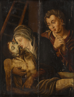 Temple sobre tabla. 92 x 61 cm. BIBLIOGRAFÍA - Post, A history of Spanish Painting, vol. IX (19547), pág. 778-783; vol. X (1950), págs. 318-323; vol. XII (1958), pág. 601 - Revista de Arte Goya, nº 99, Madrid, 1970 EXPOSICIONES: - La Pintura Gótica en la Corona de Aragón, Museo e Instituto de Humanidades Camón Aznar, pág. nº 98, del 21 de octubre al 10 de diciembre de 1980 Conocido como Maestro de Langa por la realización del retablo mayor de San Pedro en Langa del Castillo (Zaragoza), a cuyo taller se atribuyen numerosas obras de la comarca de Daroca como el retablo de la parroquia de San Miguel (ahora en la Colegiata), el de la Virgen del Hospital Municipal de Daroca (museo de la Colegiata), fragmentos de un retablo dedicado a san Gilberto... Desde el punto de vista estilístico la obra este maestro deriva directamente de la producción de Juan de Leví y Benito Arnaldín. El estilo internacional del que participa, queda personalizado en sus manos con una patente monumentalidad y una cierta deformación expresionista de las figuras, con rostros de nariz recta y ojos almendrados, y colores suaves donde dominan los azules claros y rosas. Dada la temática de la tabla que presentamos, donde vemos el cuerpo de Cristo muerto rodeado por la Virgen, San Juan, la Magdalena y la otra María, junto a José de Arimatea y Nicodemo, debió formar parte de un banco de retablo dedicado a narrar las escenas de la Pasión de Cristo. A comparar sus figuras femeninas con la conocida Virgen con el Niño de la colección Bauzá. Se adjunta una carta del profesor D. José Gudiol, del Instituto Amatller de Arte Hispánico, firmada y fechada el 13 de febrero de 1967, donde escribe: “Se trata de una obra segura del pintor estudiado por Post bajo el apelativo del Maestro de Langa”.