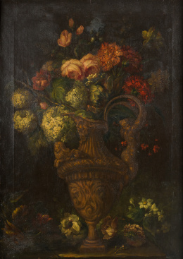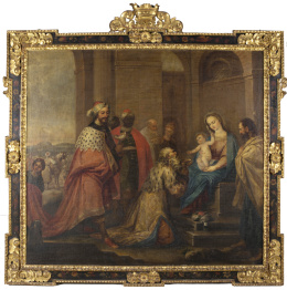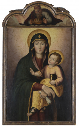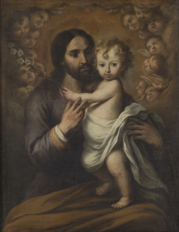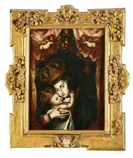 Óleo sobre lienzo. 134 x 90 cm. Obra de la mano del pintor madrileño Eugenio Cajés, hijo del italiano Patricio que trabajó en El Escorial. Las manos y el rostro de la Virgen son especialmente característicos de su estilo. Para Angulo y Pérez Sánchez, en estas obras posteriores “son frecuentes los personajes altos y derechos, con largos plegados verticales o con tendencia a lo rectilíneo” (Angulo Íñiguez y Pérez Sánchez, Historia de la pintura española. Escuela madrileña del primer tercio del siglo XVII, Madrid, Instituto Diego Velázquez, csic, 1969, pp. 212-214). A ello hay que añadir la presencia del tenebrismo correggiesco, de interpretación blanda y suave, con claro sabor manierista visible en la posición inestable del Niño. El Museo del Prado conserva un lienzo titulado La Virgen con el Niño y ángeles, 1618 (O/L, 160 x 135 cm.; ref. P03120), donde se aprecia una postura similar a la de la Virgen y el Niño que ahora ofrecemos. Para Pérez Sánchez, A. E. esa composición podría basarse como “primera idea, aún imprecisa” en el dibujo que conserva también el Museo del Prado (ref. D00031), Esbozo de una figura de la Virgen con el Niño dormido (aguada roja y sanguina sobre papel amarillento, 170 x 145 mm., fig. 1), procedente de la Colección Real, que en su sencillez de líneas y de composición recuerda notablemente a esta obra. (cfr. Catálogo de dibujos. I. Dibujos españoles de los siglos XV-XVI-XVII, Museo del Prado, 1972, p. 39).