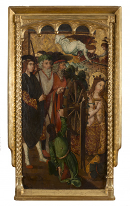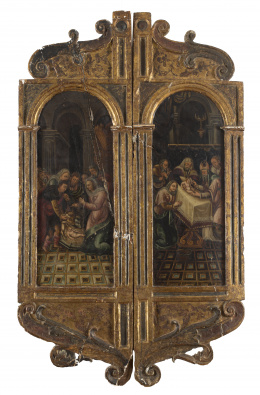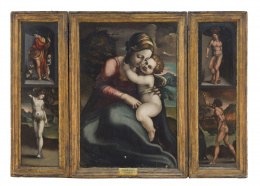 Óleo sobre tabla. Tabla central: 53 x 35 cm; laterales: 53 x 13,5 cm. Medidas totales: 61 x 85 cm. PROCEDENCIA: - Colección P. Akermann - Sotheby´s, 24 de marzo de 1965, II, 120, como Jan van Scorel - Sotheby´s, 30 de Junio de 1971, nº 78 - Colección privada DOCUMENTACIÓN: Fotografía original manuscrita al dorso por D. José Gudiol, firmada y fechada en Barcelona, 1 de Julio de 1977 BIBLIOGRAFÍA: - J. R. Buendía, La pintura española del siglo XVI, Separata de la Historia del Arte Hispánico, tomo III, El Renacimiento, Alhambra, Madrid, 1980, págs. 252 a 254, y fig. 20 (pág. 323, repr. panel central) - Nicola Dacos, “Pedro Machuca en Italia”, en Scritti di Storia dell’arte in Onore di Federico Zeri, 1984, págs. 363 y 354, láms. 346 y 347 - Ana Ávila, “Repercusión de la Batalla de Cascina en la pintura de primer Renacimiento”, en Revista de Arte Goya, nº 190 Enero-Febrero 1986, pág. 196, il. nº 4, y págs. 198 y 200 En palabras de Francisco de Holanda, conocidas por casi cualquier aficionado al mundo, Pedro Machuca fue, junto a Diego de Siloé, Bartolomé Ordoñez y Alonso Berruguete, "unas de las águilas del Renacimiento español". Toledano de origen, pronto viajó a Italia para conocer de primera mano las novedades que llegaban del país vecino. Y así, tras terminar su formación en los talleres de Miguel Ángel y de Rafael, en 1520 aparece ya trabajando en España, donde destacará fundamentalmente por la novedad y calidad de su propuesta arquitectónica, una serena alianza entre el manierismo italiano y la austeridad española. Poco conocida aún, y muy exigua, es su producción pictórica. Las dos exquisitas tablas de su mano que conserva el Museo del Prado muestran un estilo personal inconfundible, a base de elementos propios y de débitos de los grandes ya citados así como de Leonardo, Rosso Fiorentino, etc. Tras aparecer en el mercado internacional en 1965, fue estudiado posteriormente por el especialista Buendía, quien lo adjudicó sin dudas, con otras tres obras inéditas, a Machuca en 1980, añadiendo que "por estar en relación con la Virgen y el Niño (Londres, col. part.) publicada por Longhi, lo consideramos del momento italiano" (pág. 254). En cambio, para la especialista Nicola Dacos, que publicó el tríptico completo, “fue ejecutada a su regreso a España” (pág. 352), como homenaje a Miguel Ángel. Esa huella parece percibirse tanto en el contraposto de María como en los estudios anatómicos de desnudos de las otras figuras -Ana Ávila vio en ellos el eco miguelangelesco de su Batalla de Cascina (pág. 19)-; la preocupación por los efectos lumínicos, tanto de las figuras de Adán y Eva como del Niño, y por los claroscuros difuminados, recuerdan más a Rafael, matizados con un color que apunta a las obras de Beccafumi, con quien debió coincidir en el taller de Perín del Vaga en Siena.
