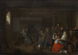 Óleo sobre tabla. 46,5 x 63,2 cm. Firmado: “Jan Molenaer”. Con etiqueta al dorso de la Sala Parés, nº 12861, y etiqueta de “Gander & WhiXXX, Mr. Maragall”. La tabla de Molenaer representa un juego popular, cuyo origen parece remontarse hasta la Edad Media, denominado Handjeklap, algo así como choque de manos (main chaude). Uno de los participantes en el juego, de espaldas para no ver, ofrece la palma de su mano al resto para que sea chocada o golpeada según se quiera; por el tacto, debe adivinar quién se trata y, lógicamente, hasta que no lo adivine, seguirá ofreciéndola. La escena de taberna, que debía ser muy común en la Holanda de Molenaer, es presentada cargada de teatralidad, con un cierto carácter satírico; se percibe la alegría del juego en unos, en otros la del vino y en los terceros, el intento de establecer relaciones amorosas. Todo ello no deja de ser una excusa para presentar unos caracteres provincianos en un espacio cerrado y la oportunidad de mostrar distintos objetos con texturas y colores variados, con un marcado efecto de claroscuro. A comparar con otras dos tablas (lotes 75 y 79) de misma temática vendidas en Sotheby´s Amsterdam el 15 de noviembre del 2015, y según el especialista Dennis P. Weller realizadas en la década de 1640 o ligeramente después, y una tercera de mayor tamaño, y hacia 1650, conservada en el Fine Arts Museum de Budapest (núm. 264).