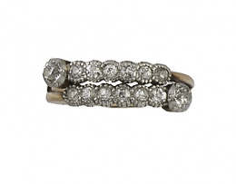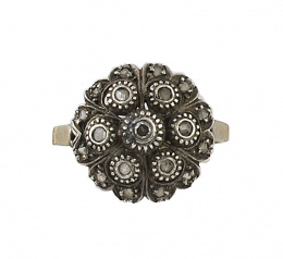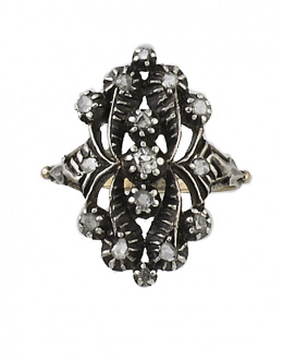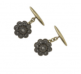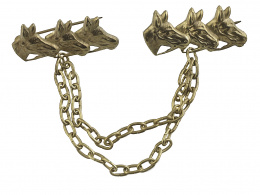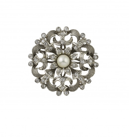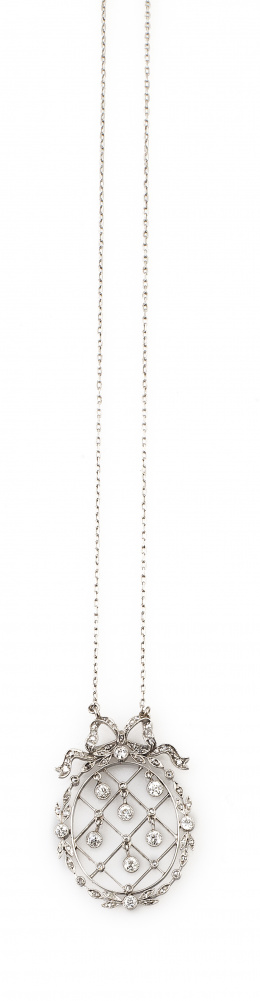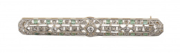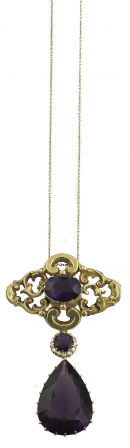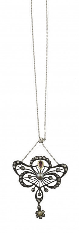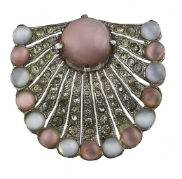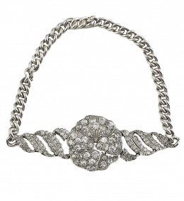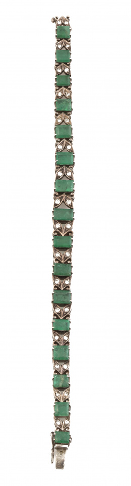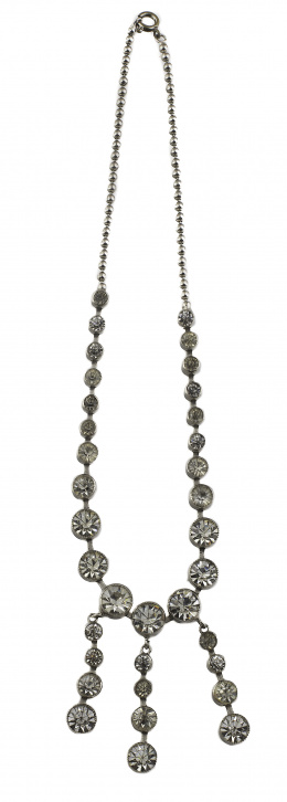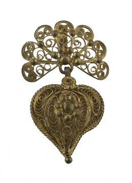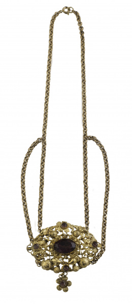 - Pulsera ancha articulada años 40 de metal dorado. Medidas: 18 x 3,4 cm - Colgante de metal dorado con diseño de abanico del que pende un corazón con decoración en filigrana. Medidas: 3,3 x 3,5 cm. - Broche de metal dorado en forma de dragón chino del que pende una esfera de reloj. Reloj pendiente de revisión. Medidas: 4,3 x 5,7 cm. Diámetro: 21 mm. - Broche de metal plateado de diseño de lazos y hojitas con símil central de esmeralda rodeado de símil de brillantes. Medidas: 2,5 x 5,8 cm. - Collar de dos hilos de perlas de bisutería con cierre de metal plateado cuajado de símil brillantes y perla central. Longitud: 50 cm. - Broche de metal plateado y strass, de diseño de plumas de los años 30. Medidas: 3,8 x 7 cm - Collar de eslabones en metal dorado. Longitud: 49,5 cm - Collar de metal plateado de eslabones con un colgante plateado del rostro de Cristo coronado y otro de un símil de zafiro talla navette orlado de símil brillantes talla navette. Longitud: 58,5 cm - Collar de eslabones de metal dorado con una medalla de metal dorado de Cristo y el sagrado corazón. Longitud: 65,5 cm. Medalla: 2,5 x 2,7 cm. - Cadena de eslabones de metal plateado del que pende un reloj ovalado, con decoración grabada de cesta con flores. Reloj pendiente de revisión. Longitud: 69 cm. Medidas reloj: 2,8 x 3 6 cm. - Cadena de metal con dos colgantes en forma de concha, una con la representación de la Virgen de Fátima, otra con el sagrado corazón y una cruz de plata con piedra central azul. - Collar de eslabones de metal plateado con un pequeño colgante en forma de campana y una medalla oval de santo. Longitud: 57 cm - Cadena plateada con medalla de un santo franciscano y un niño Jesús. Diámetro medalla: 25 mm. - Conjunto de tres horquillas de metal dorado, una con motivo de abanico y dos con motivos de coronas y decoración interior de roleos vegetales. Medidas: 2,5 x 7 cm. - Pendientes colgantes de metal dorado con dos perlas de cristal en degradé. - Gemelos de metal dorado con imagen de toreo. Frente: 1,5 x 1,1 cm - Pulsera rígida de metal dorado, con símil de esmeralda en el frente flanqueado por dos piezas triangulares de metal plateado. Diámetro: 61 mm.