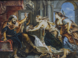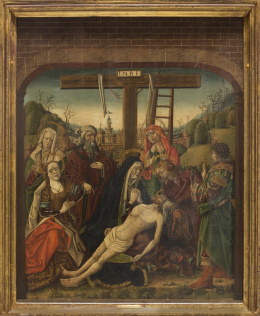 Óleo sobre tabla. 159 x 129 cm. Esta importante tabla inédita, de indudable depurado estilo, nos sitúa en Castilla cuando florecía el estilo hispanoflamenco, a finales del siglo XV o comienzos del XVI, y nos acerca al importante pintor Fernando Gallego (1468-1570). A través de un arco adintelado, resuelto severamente con un paramento de ladrillo que crea una profundidad evidente, el pintor representa en un paisaje la lamentación de la Virgen con el cuerpo de Cristo en su regazo, acompañada por las tres Marías, san Juan, Nicodemo y José de Arimatea. Con dibujo firme, el autor define no sólo los contornos de las figuras sino sus variados gestos dramáticos, forzados e inestables, de intensa mirada, que no mitigan en absoluto el horror del momento, recurso muy habitual en la producción de Gallego. Cabe destacar la peculiar grafía con que el pintor resuelve las barbas de Nicodemo y la forma de plegar las telas, casi artificial; ambas notas ayudan, junto a los gestos y actitudes de los personajes, al desarrollo de la acción. Las telas que caen sobre el suelo, quedando como amontonadas en un primer plano, recuerdan a Campin o a van der Weyden. Al fondo, un paisaje, Jerusalén, con motivos arquitectónicos que no olvida el más mínimo detalle con una gran peculiaridad en el modo de resolver las vegetaciones, con arbustos esbozados de manera sencilla. A comparar con el Tríptico de Santa Catalina de Francisco Gallego conservado en el Museo Catedralicio de Salamanca, especialmente en el modelo de María, tanto en la disposición como en la manera de resolver el nimbo (Ver: Pilar Silva Maroto: Fernando Gallego, Salamanca, Caja Duero. 2004, pág. 431).