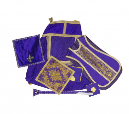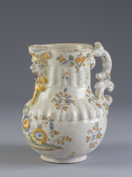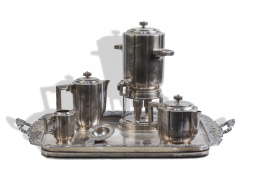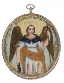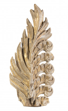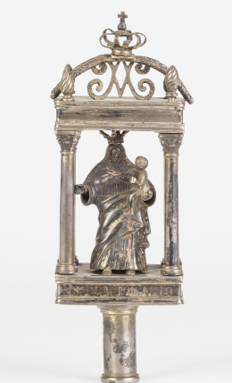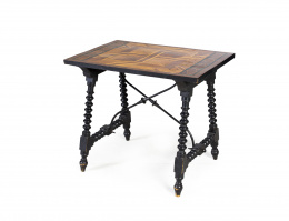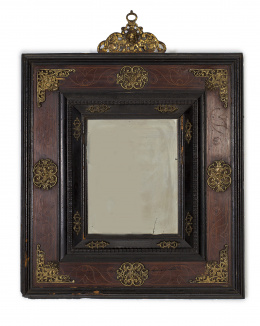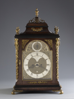 La parte superior con frontón partido, en el medio remate de madera tallada y dorada. Seguido por dos puertas que albergan "pigeon holes" y espacios  verticales para documentos, con dos cajones en la parte inferior y soportes para velas, apoya en escritor con cinco cajones los superiores partidos y el resto corridos. Sobre pies de bracket (de época posterior).