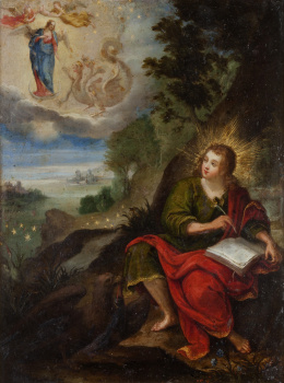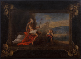 Este magnífico cobre, firmado por Van Balen, representa el momento en que la Diosa Minerva visita a las musas en el monte de Helicón. Sobre un riquísimo paisaje de delicada factura y cuidadosos detalles vegetales y florales, el pintor dispone el grupo de las nueve musas que mueven sus brazos acorde al ritmo de los instrumentos musicales y las partituras; cantan las maravillas de los Dioses y son una personificación de las virtudes invocadas por poetas y pintores. Cerrando ésta equilibrada composición, la figura de Minerva a un lado y, al otro en lo alto Pegaso que rompe con una coz la roca donde mana un torrente de agua cristalina. Según la mitología griega: “las Piérides se enfrentan con las Musas en un concurso de canto al pie del monte de Helicón, este tan complacido por la belleza de las voces que empezó a crecer de manera desmesurada amenazando con llegar al cielo. Al ver el peligro, Poseidón mandó al caballo alado Pegaso que fuera y golpeara la montaña con uno de sus cascos para ordenarle que volviera a su tamaño natural, a lo que la montaña obedeció dócilmente, pero en lugar donde Pegaso la había golpeado brotó la fuente de Hipocrene”.