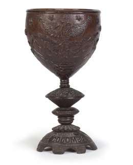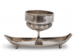 Marca tres veces impresa: Entre columnas coronadas cabeza varonil sobre M; varias buriladas.  Otras señales grabadas en el interior del pie: cruz patada, una estrella y una cruz griega. Escudo heráldico bajo corona marquesal.